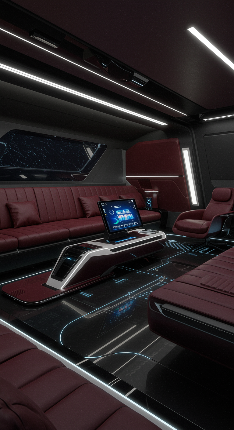 Imagine an avant-garde interior living space that seamlessly blends the luxurious essence of the 2024 Toyota Crown with futuristic AI-driven design elements. The room is enveloped in plush, high-tech materials inspired by the car's sleek upholstery and color palette, featuring deep burgundy leather and accents of brushed aluminum. A central AI hub, resembling a sophisticated car dashboard, controls ambiance settings, adjusting lighting and temperature to enhance comfort. Fluid, aerodynamic lines echo the vehicle's dynamic contours, while an innovative seating arrangement mirrors the car's ergonomic design, providing both function and elegance. Ambient lighting emanates from discreet, car-inspired fixtures, casting a soft glow that transforms the space into an oasis of modern luxury. The flooring is reminiscent of a car showroom’s polished elegance, with interactive panels that respond to movement, seamlessly integrating technology and design in a harmonious living environment.