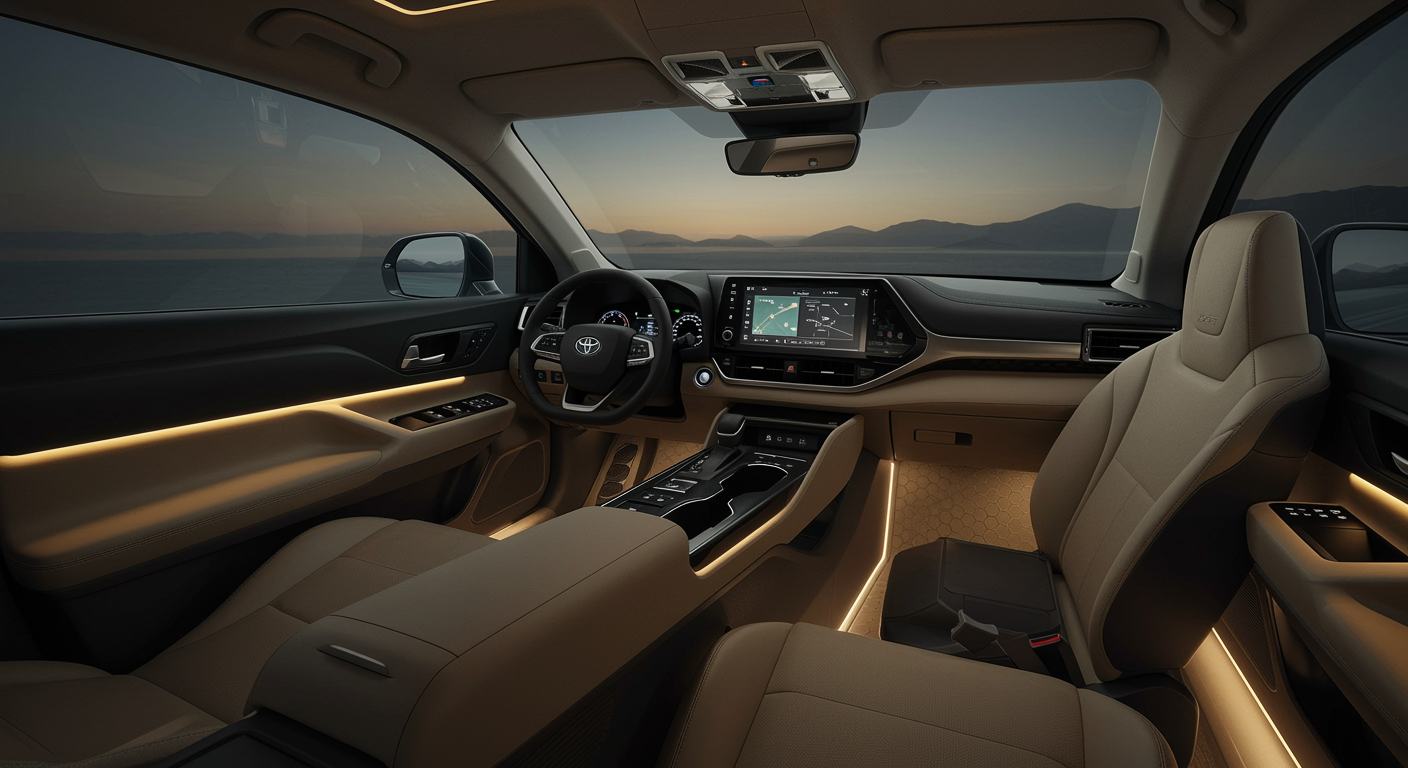 Envision an AI-designed interior space inspired by the 2024 Toyota Highlander, where sleek sophistication meets futuristic technology. The room features smooth, contoured surfaces and high-quality materials reminiscent of a luxury automobile. Ambient lighting casts a warm glow over the interior, highlighting intricate details innovatively integrated with intelligent systems. A dashboard-style control center sits at the room's heart, seamlessly connecting comfort with advanced AI capabilities. The seating areas mimic plush, ergonomic car seats, offering both relaxation and style. The space evokes a sense of motion and dynamic elegance, as though a luxurious SUV was transformed into a modern living environment.
