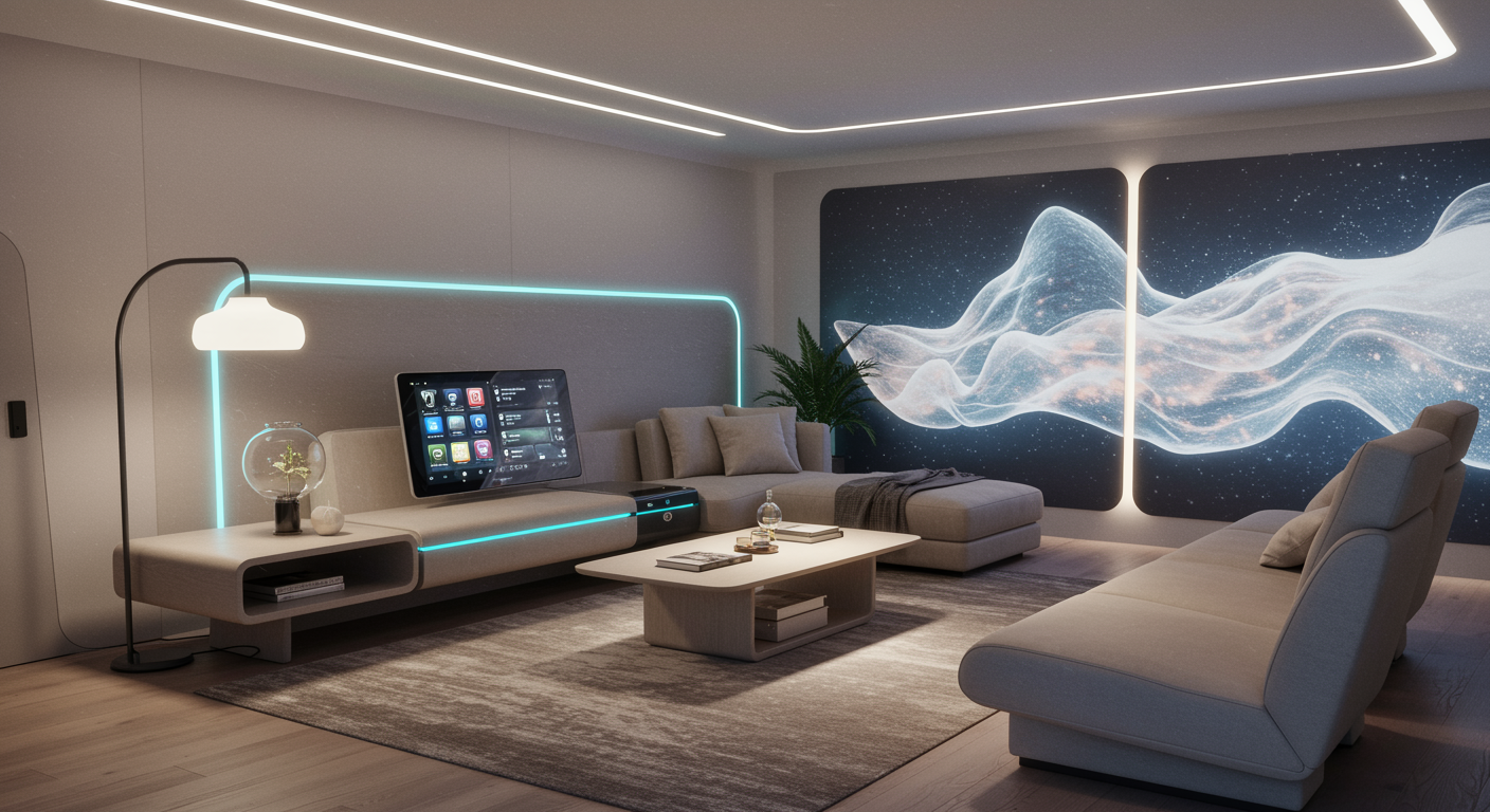 Imagine a futuristic living space inspired by the interior of a Volvo XC60, where Scandinavian design meets advanced AI functionality. Sleek, elegant lines of the car's dashboard translate into minimalist furniture pieces, blending wood and metal into seamless harmony. Soft ambient lighting mimics the car's soothing cabin glow, while neutral tones are punctuated by vibrant accents reflecting digital control displays. The room’s AI system personalizes comfort, with smart air filtration echoing the vehicle’s high-tech climate control, and AI-driven wall panels displaying dynamic artistic renditions, offering tranquility or stimulation depending on the mood. The integration of technology and aesthetics creates an inviting, intelligent space, echoing the Volvo's commitment to safety, efficiency, and modern elegance.