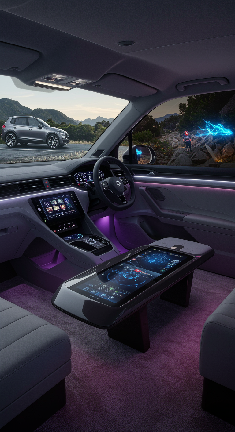 Imagine a futuristic interior space where the sleek luxury of a VW Atlas car interior melds seamlessly with cutting-edge AI design. Envision a living room that mirrors the elegant dashboard contours and premium upholstery of the Atlas, featuring an intelligent ambient lighting system that adapts to your mood, and embedded touchscreens in the furniture's surface that allow interaction with a virtual assistant for home control. The walls emulate the car's advanced infotainment system, displaying dynamic art and providing immersive sound experiences. The space feels like a harmonious blend of automobile excellence and home innovation, inviting exploration and comfort.
