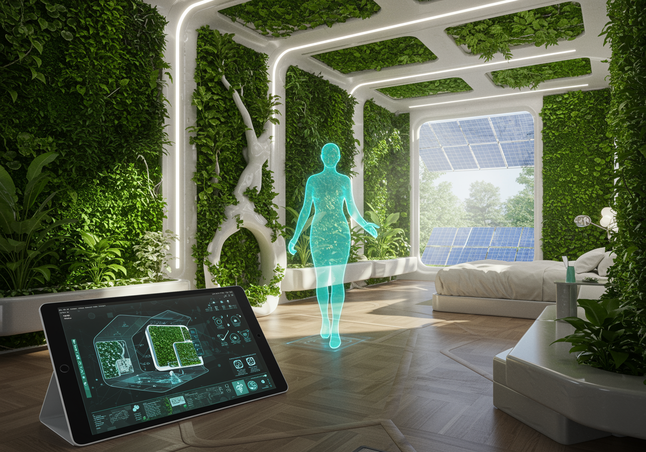 A futuristic room designed by an AI, seamlessly blending organic elements with high-tech features, where the walls are living vertical gardens and the furniture is made of sleek, recyclable materials. In the center, a holographic assistant symbolizes the "Secretary of Interior," dynamically adapting the space's ambiance—lighting, temperature, and visual aesthetics—to the user's mood and needs. Natural sunlight filters through smart windows made of transparent solar panels, casting intricate patterns on the floor. The digital blueprint on an eco-friendly tablet displays an AI algorithm optimizing not just interior aesthetics but also environmental sustainability, a harmonious convergence of technology and nature.