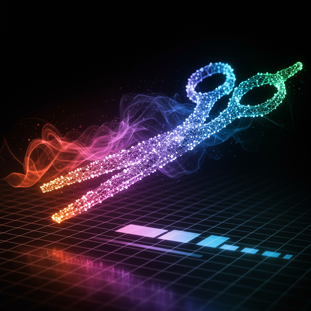 Imagine a sleek, futuristic pair of scissors made entirely out of interconnected digital pixels, their blades shimmering with the colors of a vibrant spectrum as they hover over a grid-like video timeline. Each pixel seems to pulsate with energy, hinting at the underlying power of transformation and creativity. Surrounding the scissors, ethereal wisps of light form abstract shapes representing video frames being seamlessly edited, merging technology with artistry. This image captures the essence of a modern digital editing tool, embodying both precision and imagination in the realm of content creation.