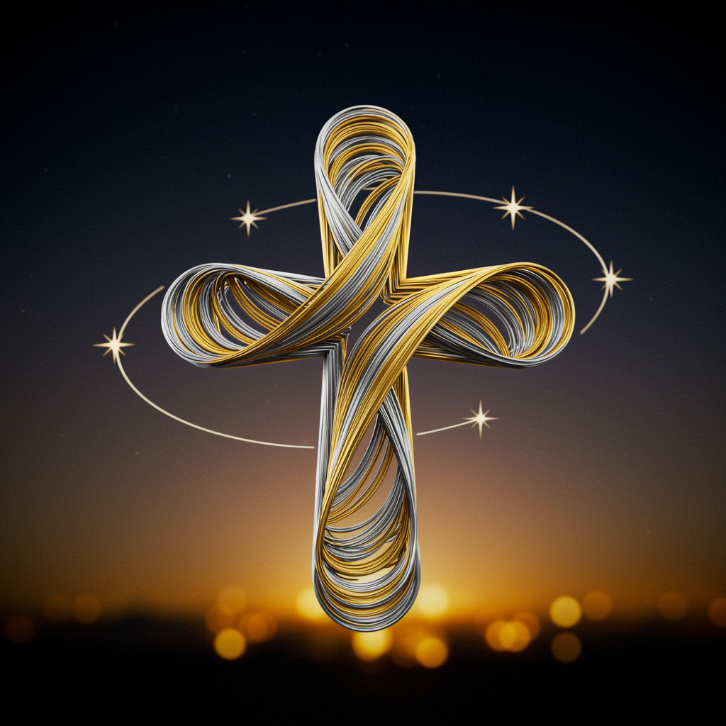 "Envision a sleek, modern cross icon, crafted from intertwining threads of silver and gold, set against a background of a softly glowing, celestial night sky. The cross appears to be gently pulsating, radiating a sense of balance and unity, symbolizing the intersection of diverse paths merging into a harmonious journey. Small stars orbit around the cross, adding a touch of ethereal wonder, capturing the essence of a timeless emblem designed for a brand seeking to convey sophistication, peace, and celestial harmony."