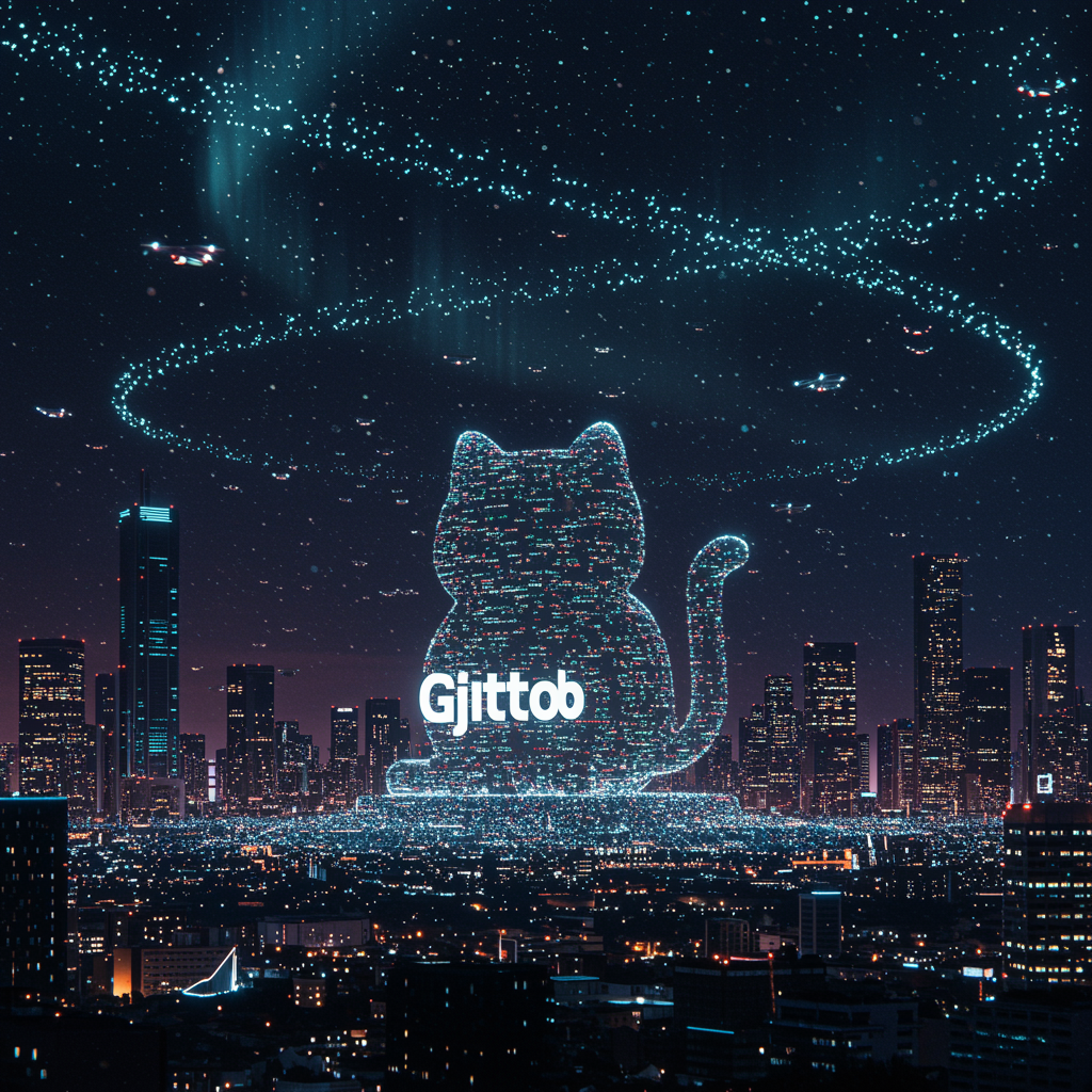 "Imagine a futuristic cityscape at night where the skyline is composed of towering, sleek skyscrapers, each with a glow that illuminates the sky. In the center, a colossal, shining monument stands: it is shaped like the GitHub Octocat, but its surface is made of a complex, glittering mesh of digital code and circuitry. The city is alive with the energy of creators and innovators, and the GitHub icon is a beacon of collaboration, casting its light far and wide. Around it, tiny drones represent the countless coders working together, forming a symphony of innovation beneath the subtle, shimmering auroras of digital data swirling across the night sky."
