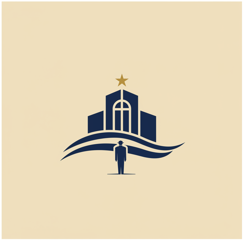 Imagine a sleek, minimalist design capturing the essence of a luxurious hotel in a single icon: a stylized, modernist building silhouette with grand arched windows, a welcoming doorman in silhouette tipping his hat, subtly incorporated into the base; above, the abstraction of a five-point star elegantly melds with waves symbolizing comfort and service, crafted in a soothing gold and deep blue color palette to evoke sophistication and warmth.