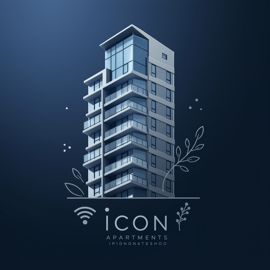 Imagine a sleek, modern icon featuring a stylized high-rise apartment building with shimmering glass windows and balconies. This compact graphic merges elements of urban architecture with subtle geometric shapes, hinting at luxury and contemporary living. The icon incorporates shades of steel blue and silver to convey sophistication and elegance, with gentle curves seamlessly blended into the structure to suggest comfort and style. In the foreground, minimalist symbols of community and connectivity, like a Wi-Fi signal and a leafy branch, add depth and narrative, representing the blend of modern technology and serene living found in Icon Apartments.