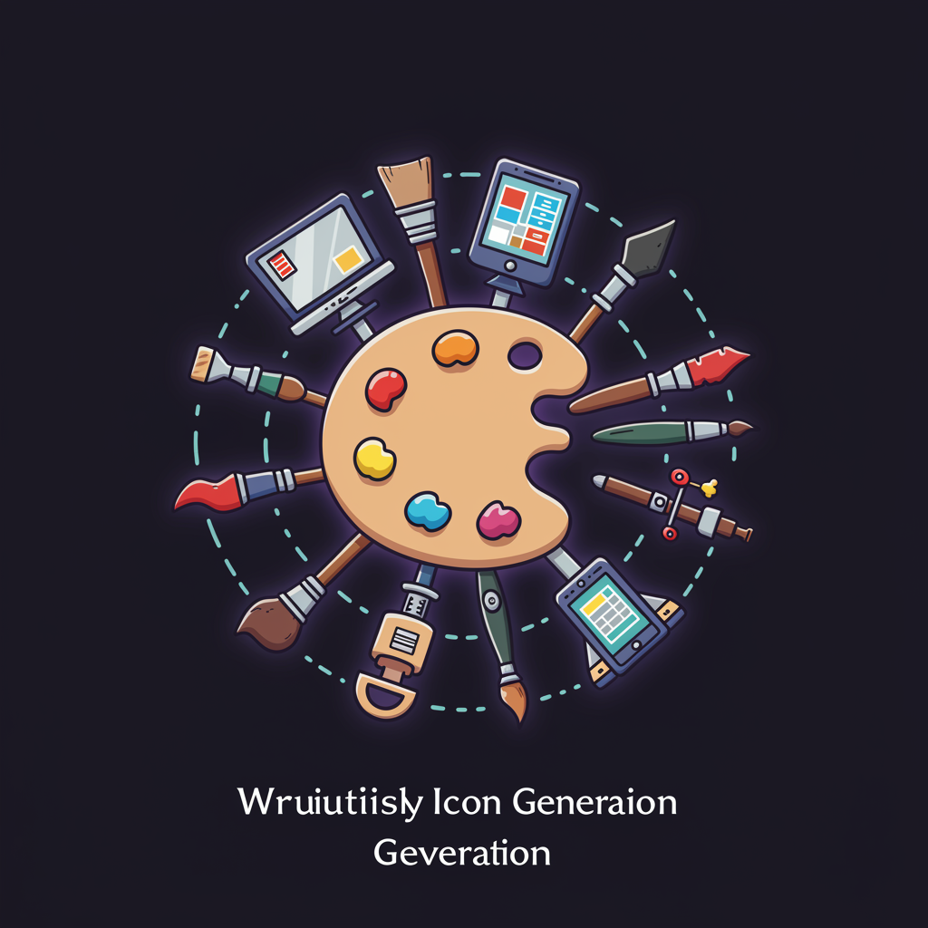 "Design a whimsical and futuristic icon generator where abstract gears and digital brushes intertwine to form a vibrant palette, symbolizing limitless creativity. The central icon resembles a glowing paint palette with miniature tools orbiting around it, each representing diverse art styles, evoking a sense of artistic discovery in a sleek, minimalist form."