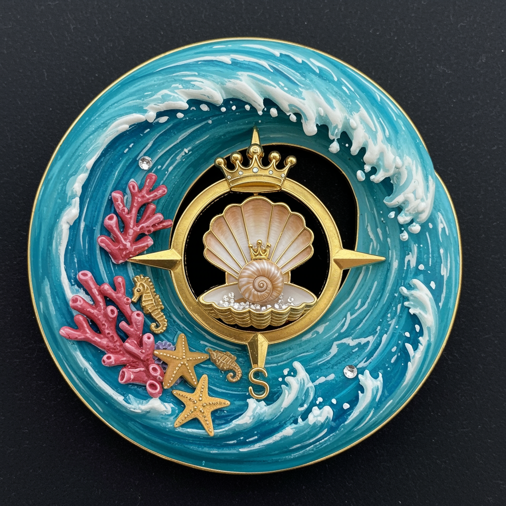 Imagine a vibrant, miniature emblem depicting a majestic ocean wave, intricately woven with elements of coral reefs and marine life. At the crest of the wave, a golden compass rose spins gently, adorned with tiny sea creatures like starfish and seahorses. In the heart of this aquatic swirl, a sparkling seashell houses a crown, symbolizing the reigning power of the seas. The colors are a harmonious blend of deep blues, shimmering silvers, and glowing turquoise, reflecting the serene yet dynamic nature of the ocean. This captivating icon embodies the spirit of maritime adventure and exploration, promising a journey through the wonders of the sea.