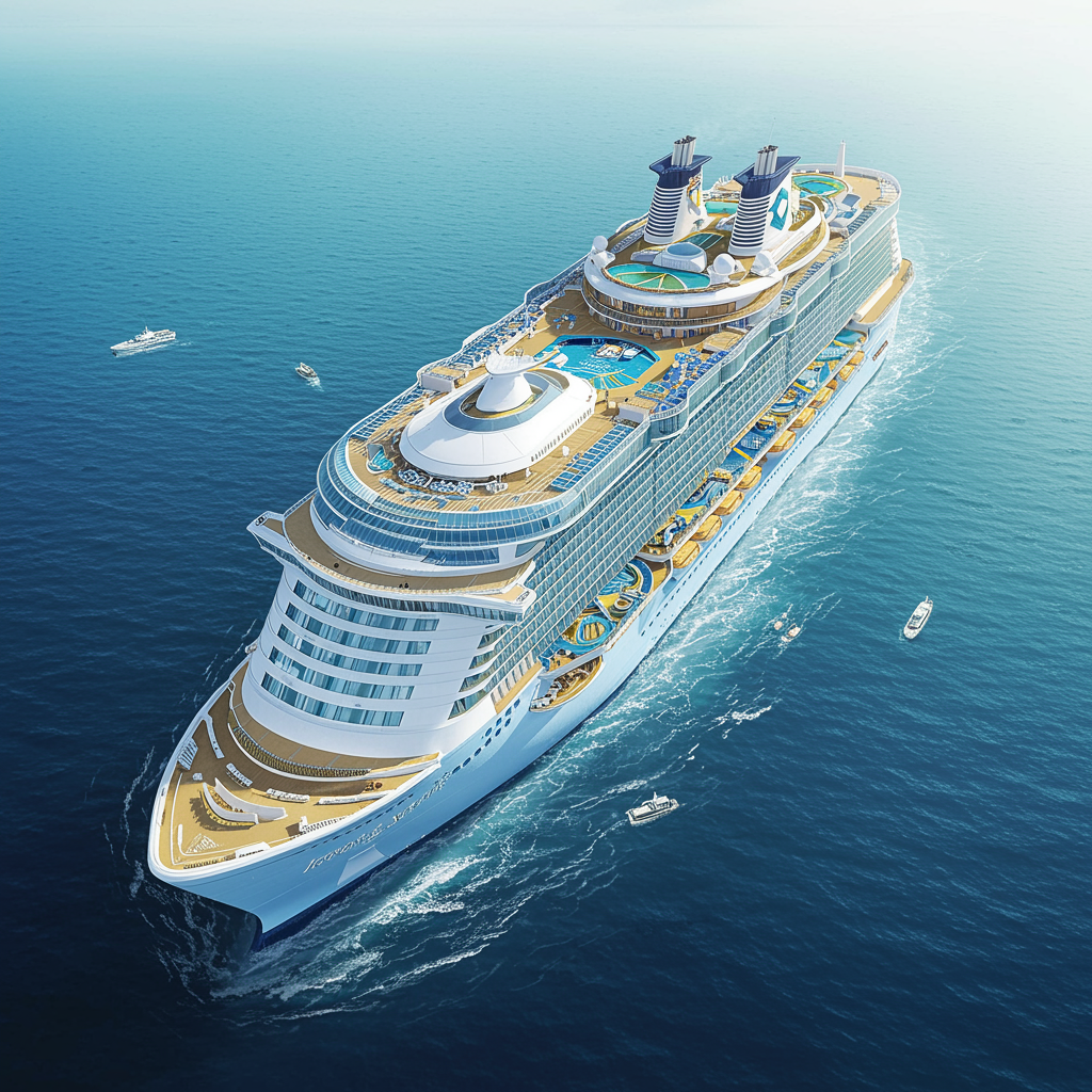 "Visualize a vibrant and futuristic icon depicting the intricate deck plans of the 'Icon of the Seas,' showcasing a symphony of marine life and innovative engineering. Imagine a small, yet detailed, emblem where each deck level is represented by swirling ocean waves intertwined with elegant structural lines, each section hinting at the luxury and adventure found on the ship. The icon captures the essence of exploration and maritime excellence, using a palette of oceanic blues, pearlescent whites, and golden accents to evoke a sense of wonder and opulence, perfect for a brand synonymous with cutting-edge cruise experiences."