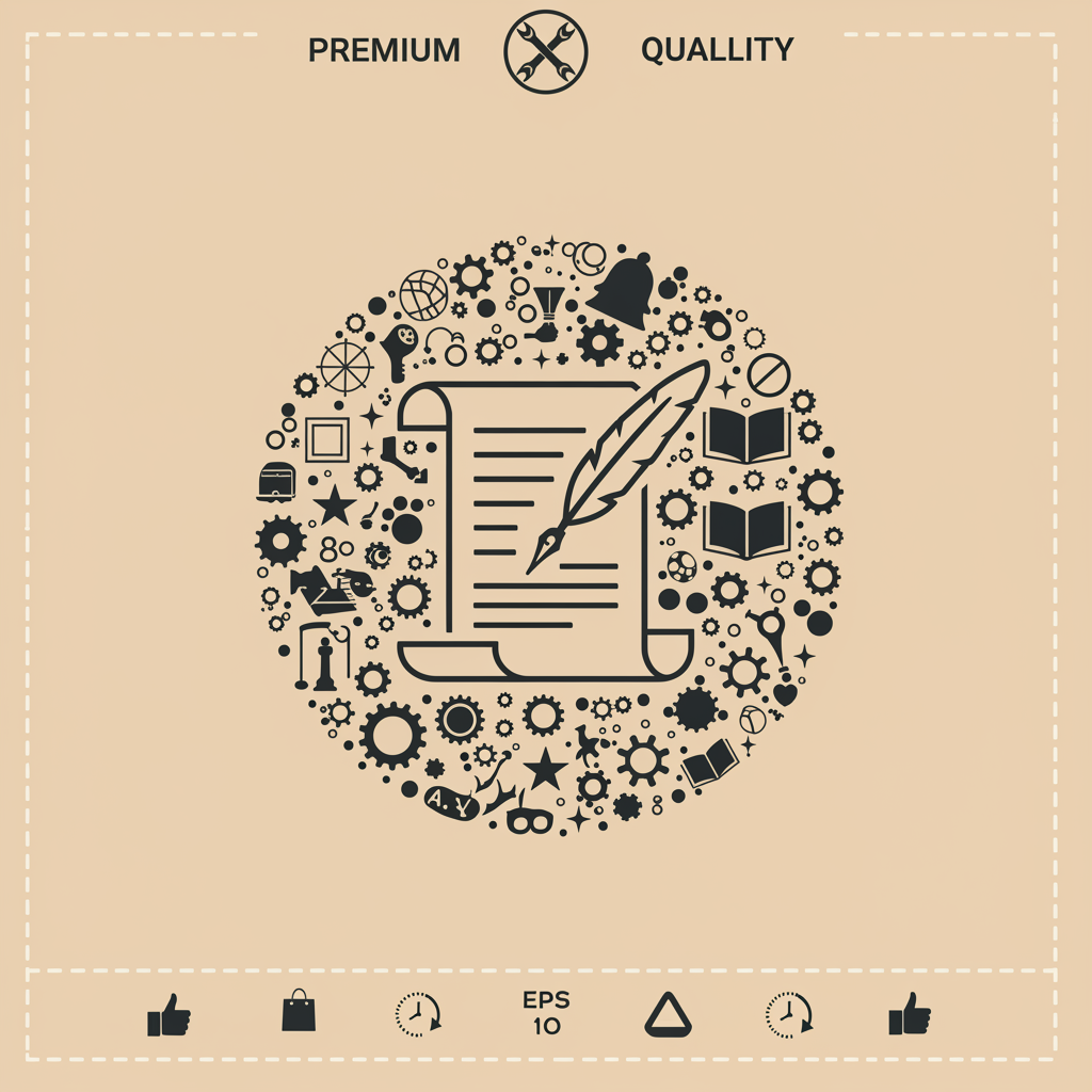 "Imagine a sleek, minimalist design featuring a quill pen floating atop a scroll surrounded by a halo of diverse symbols such as stars, gears, and books, seamlessly blended to depict a modern take on the timeless concept of 'icon synonym'—a visual metaphor where each element represents a different synonym of 'icon,' from emblem and figure to sign and representation, unified in harmonious balance."