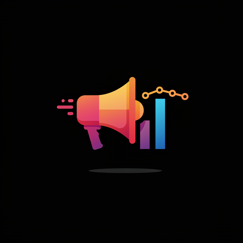 "Design a sleek, modern icon featuring a stylized megaphone morphing into a digital graph, symbolizing the powerful fusion of traditional and digital marketing strategies, with vibrant colors to convey energy and innovation, encapsulated in a compact, visually engaging design that captures the essence of dynamic market connections."