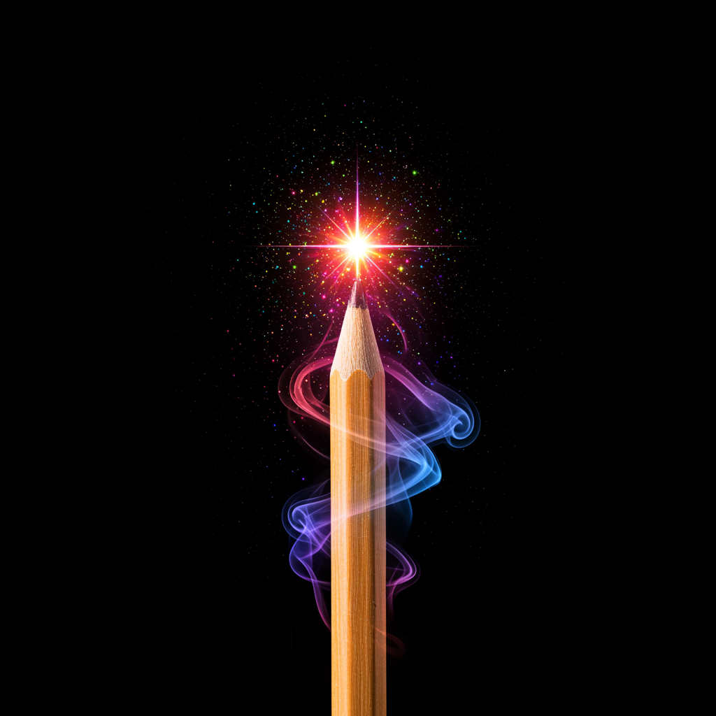 A whimsical amalgamation of a wooden pencil standing upright, its sharpened end delicately morphing into a vibrant, pulsing star that emits tiny specks of multicolored light, symbolizing creativity and endless possibilities, while the eraser at the opposite end is gently encircled by a swirl of ethereal smoke that gradually transforms into a spectrum of radiant colors, representing the infinite potential to reshape and redefine ideas.