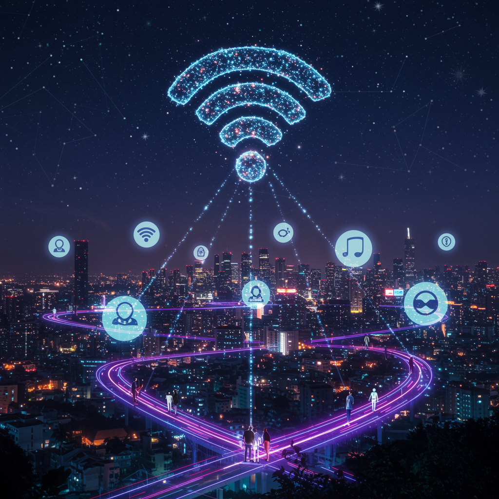 Visualize a futuristic cityscape where towering skyscrapers are interconnected by glowing, neon pathways. In the sky above, a massive, ethereal wifi icon made of twinkling stars and shimmering digital streams hovers, sending vibrant pulses of connectivity throughout the urban landscape. Each pulse transforms into playful holographic symbols representing diverse aspects of connectivity—communication, speed, and accessibility—that interact dynamically with city inhabitants below, depicting a harmonious blend of technology and everyday life. The scene emanates a sense of limitless potential and global unity, framed by a panoramic night sky filled with swirling constellations that form abstract connections akin to a vast network.