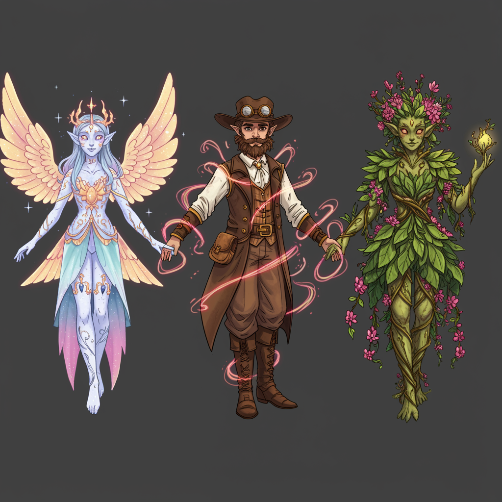 Three whimsical characters stand side by side, each distinct yet connected through a series of vibrant, swirling patterns that dance between them. The first character is an ethereal being with luminescent wings, their eyes sparkling with stardust. The second is a steampunk adventurer, gears and cogs subtly integrated into their attire. The third is an earthbound nature spirit, cloaked in leaves with a cascade of blooming flowers trailing down. Despite their differences, a magical energy links them—alluding to their shared story—forming a harmonious triad that symbolizes unity in diversity and perfect for matching profile pictures across social media.