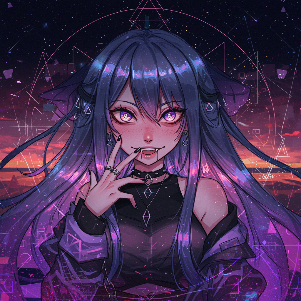 An intriguing digital artwork depicting a mysterious anime girl with striking, enigmatic eyes that seem to tell endless stories. Her playful smirk suggests a hint of suspicion, as if she holds secrets untold. Her hair flows in an unusual shade resembling a twilight sky, with hints of luminescent stars subtly woven through. She's surrounded by a kaleidoscope of ethereal colors and geometric patterns, symbolizing innumerable possibilities and attempts, each representing a new dimension of her enigmatic persona. Her attire is a fusion of contemporary street fashion and fantasy elements, exemplifying both modernity and a touch of the mystical. This unique avatar captures the essence of intrigue and complexity, inviting viewers to delve deeper into the mystery she embodies.