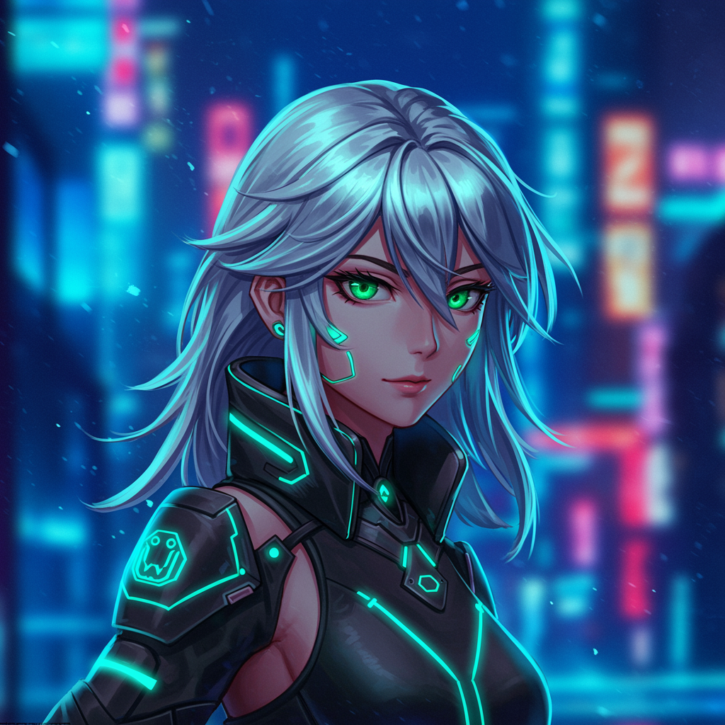 A vivid and enchanting anime character with striking emerald-green eyes and flowing silver hair, dressed in futuristic attire featuring intricate details and glowing neon patterns, against a backdrop of a bustling cyberpunk cityscape bathed in hues of electric blues and purples, capturing the aura of mystery and allure in a crisp 4k resolution suitable for a captivating profile picture.