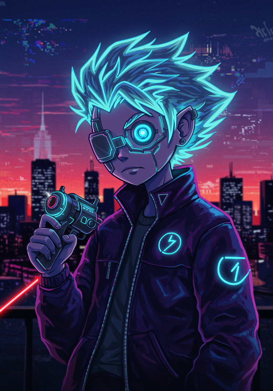 An avant-garde digital illustration showcasing an electric-haired character with a futuristic robotic eye, wielding a sleek, neon-tinged mini laser gun, set against a vibrant urban skyline at dusk, with hints of graffiti art and pixelated holograms, perfectly capturing the rebellious yet imaginative spirit of a modern-day "uzi pfp" icon for social media profiles.