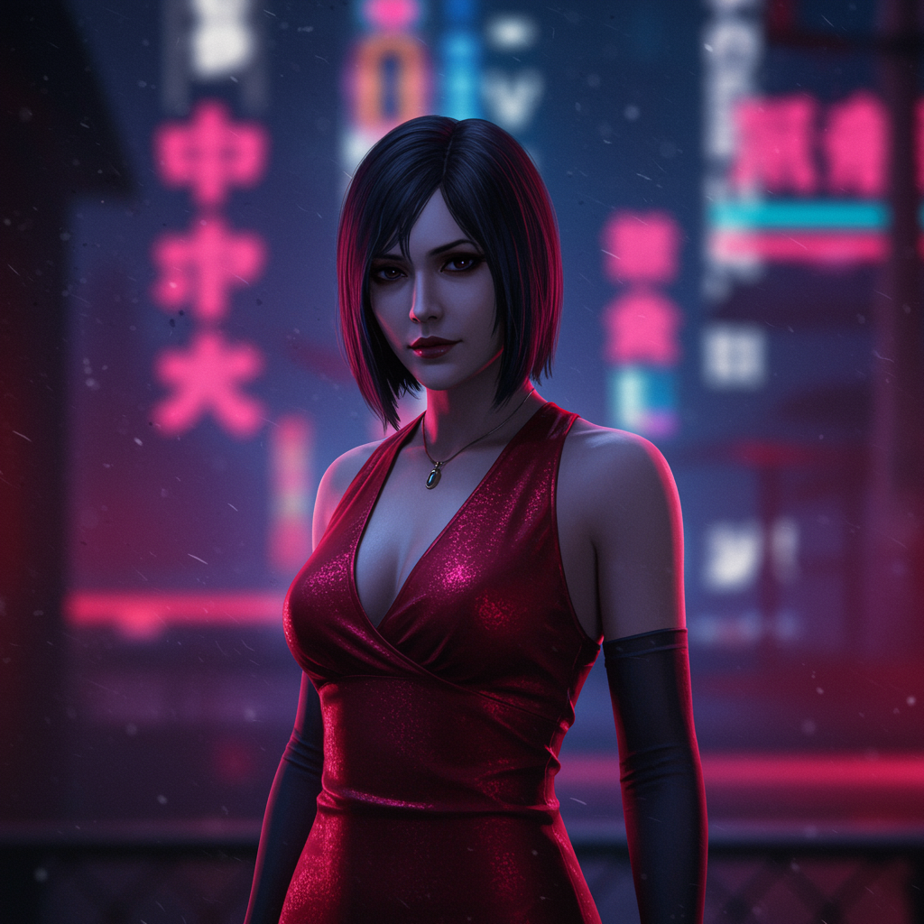 An enigmatic profile image featuring Ada Wong standing against a backdrop of a neon-lit, cyberpunk cityscape, her iconic red dress glistening under the moonlight, as her confident gaze meets the viewer with a hint of mystery, blending elements of technology and noir ambiance that capture her essence as a sleek femme fatale in a world of intrigue.