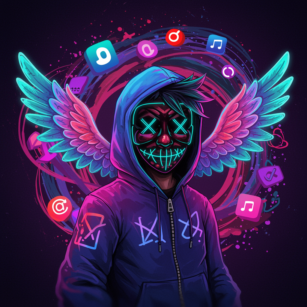 Imagine a vibrant digital world where an abstract character embodies youthful rebellion, featuring a neon-colored hoodie with an intricate pattern of pixelated wings. The character's face is partially obscured by a futuristic mask that glows with changing LED lights, revealing expressive eyes that shift colors. Behind the character, a dynamic swirl of graffiti-style art represents online connectivity and individuality, with symbols of various digital platforms interwoven into the background. This image captures the essence of a modern, tech-savvy persona thriving in the ever-evolving landscape of social media.