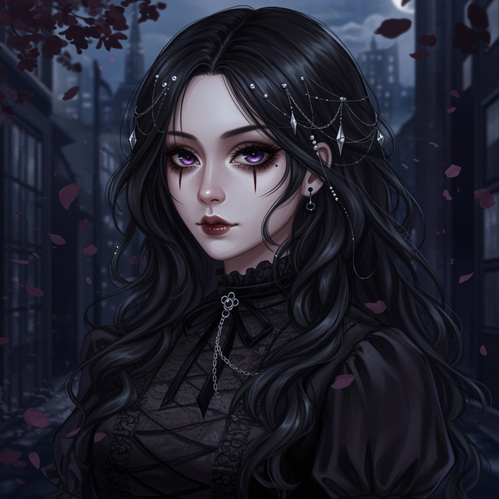 In a moonlit urban landscape, an ethereal anime girl encapsulates the aesthetic goth emo style; her porcelain skin contrasts with jet-black, wavy hair that cascades past her shoulders, adorned with delicate silver chains and tiny crystal embellishments. Her eyes, a mesmerizing deep violet, carry a hint of melancholy and mystery, framed by smoky eyeliner that highlights her enigmatic expression. She wears a Victorian-inspired dress in dark velvets, embellished with subtle lace and intricate embroidery, echoing a blend of timeless elegance and modern rebellion. Surrounding her are shadowy cherry blossom petals, drifting like whispers in the twilight, completing a hauntingly beautiful visage perfect for an enigmatic pfp.