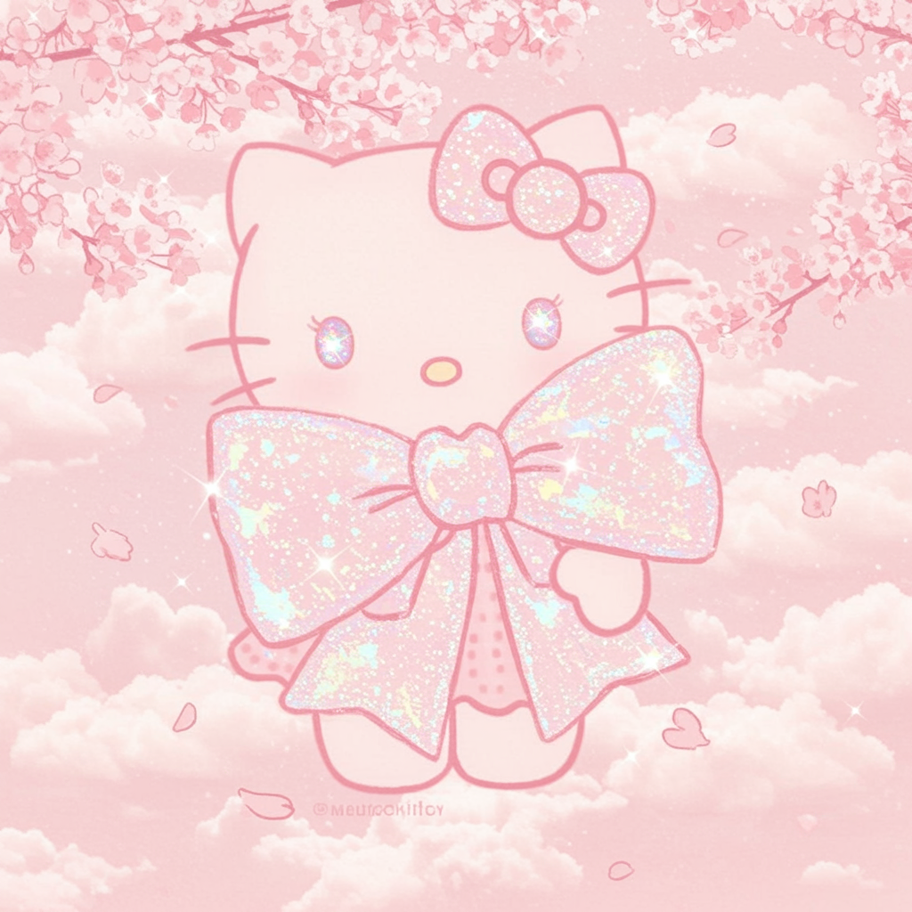 A whimsical fusion of pastel pinks and soft whites form the backdrop of the image, with Hello Kitty at the center, joyfully holding an oversized, iridescent bow that glimmers like scattered stardust. The iconic character has been reimagined with ethereal, sparkling eyes that reflect an endless universe of cozy dreams and gentle rainbows. Surrounding her, a cascade of delicate cherry blossoms and wispy clouds float serenely, creating an atmosphere of celestial tranquility. This aesthetic masterpiece serves as the perfect embodiment of a dreamy, whimsical Hello Kitty profile picture, radiating warmth and the innocence of a fairytale realm.