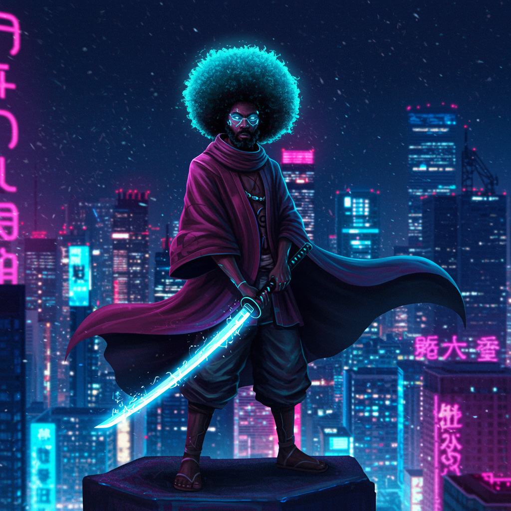 A futuristic Afro Samurai stands atop a neon-lit skyscraper, his cloak billowing in the wind against the backdrop of a cyberpunk cityscape. His afro glows with bioluminescent hues, and his eyes shimmer with determination and wisdom. He holds a katana infused with digital energy, casting vibrant reflections across his face, symbolizing strength and transcendence. The cool blues and purples of the city lights create a mystical aura, capturing the essence of a warrior who bridges the ancient and the digital, embodying both tradition and innovation in a single glance.