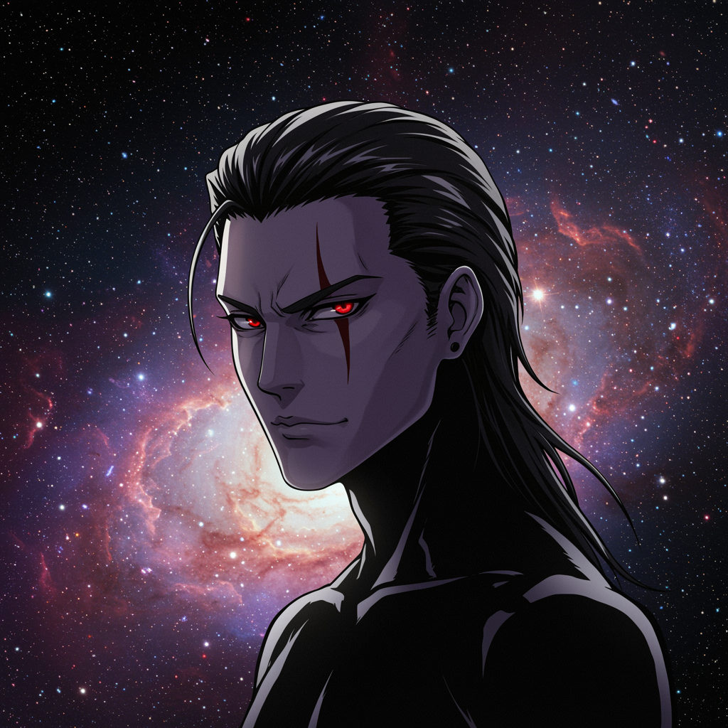 A sleek and mysterious figure with sharp features and piercing eyes stands against a backdrop of swirling nebulae, their hair seems to flow into the cosmic currents, embodying an aura of intelligence and intrigue. The vibrant colors of the galaxy hint at untold power and depth, capturing the enigmatic essence of aizen. Perfectly poised, with a faint, knowing smirk, this image captures a blend of charisma and strategy, making it an ideal profile picture for those who appreciate complexity and allure.