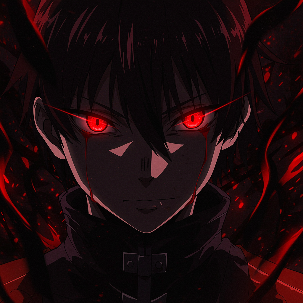 A dynamic and striking anime-style portrait featuring a character inspired by the fierce and mysterious world of "Akame ga Kill," showcasing intense red eyes that pierce through with a hint of melancholy and strength, set against a dark, atmospheric backdrop with abstract, swirling shadows and glimmers of crimson light, reflecting the character's enigmatic and powerful aura, perfect for a profile picture that captivates and intrigues viewers.