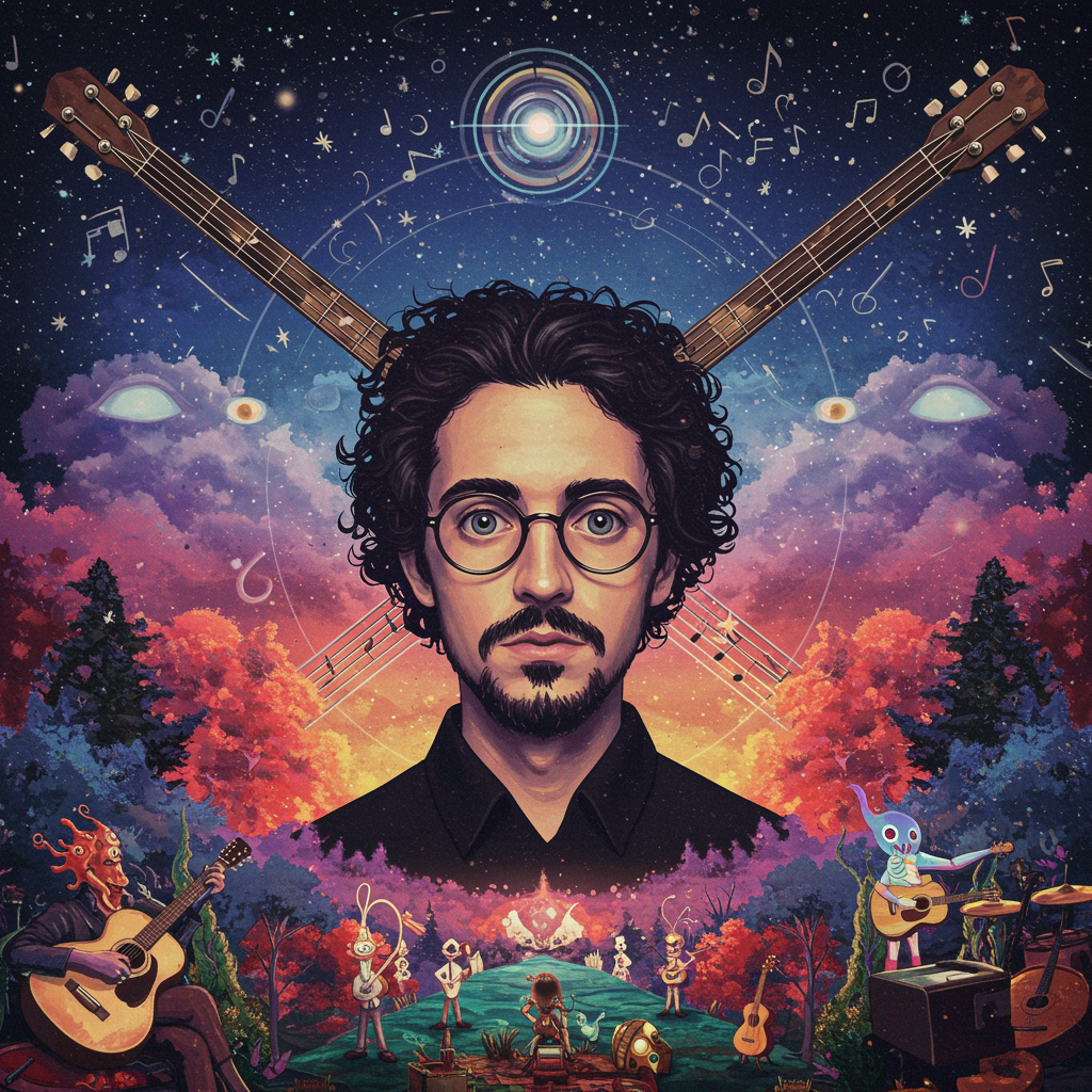 A whimsical avatar inspired by the enigmatic persona of Alex G, featuring a surreal collage of ethereal landscapes blended with musical elements; imagine a dreamlike night sky with constellations made of guitar strings, mystical creatures playing melodies in a forest of vibrant colors, all framed by a glowing aura that reflects a sense of introspection and artistic mystery.