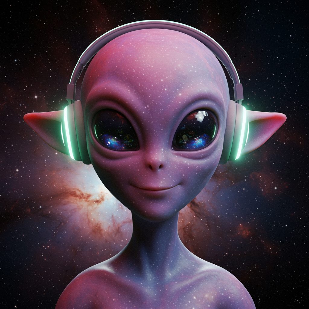 An ethereal luminescent alien with large, expressive eyes that reflect galaxies, sporting a quirky personalized accessory like glowing headphones; its skin is a shifting canvas of cosmic colors and patterns, set against a backdrop of swirling nebulae, capturing a friendly, enigmatic vibe perfect for a unique and captivating profile picture.