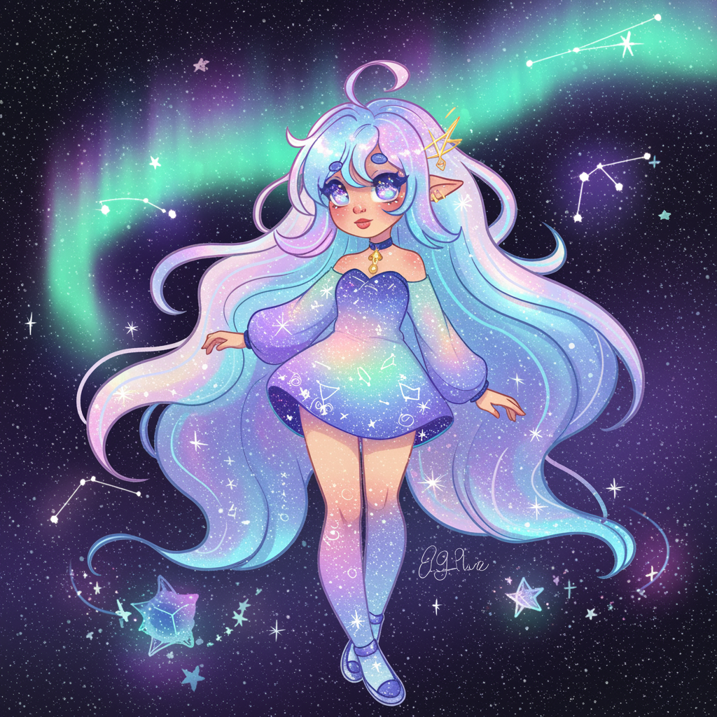 "A celestial-themed 'alya pfp' depicting a whimsical character with pastel-colored hair cascading like a waterfall of stardust, their eyes resembling tiny galaxies swirling with cosmic wonder, surrounded by floating constellations and shimmering auroras that dance across the void of space."