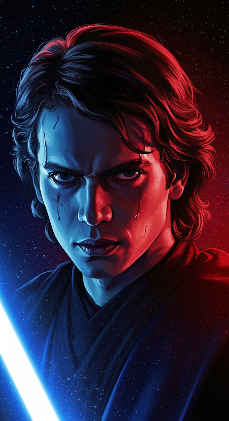Create an image featuring a stylized profile picture of Anakin Skywalker in a modern digital art style; he is portrayed as a brooding and enigmatic figure cloaked in shadows, with his iconic lightsaber subtly glowing in blue and red hues, blending into an abstract galaxy background, symbolizing the duality of his nature; his eyes, fierce and determined, hint at both a tragic past and a promising future, capturing the essence of a hero caught between light and darkness.