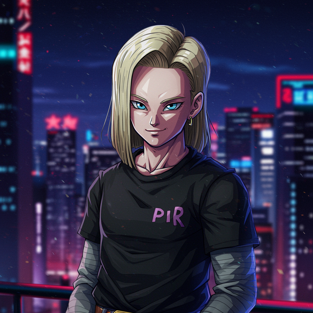 A futuristic digital masterpiece featuring Android 17, illuminated by neon city lights, with an expression of calm confidence as he overlooks a sprawling cyberpunk metropolis at night, intricate circuits reflecting a subtle glow on his sleek, polished design, blending human emotions with robotic precision, capturing a fusion of machine and soul perfect for a striking and memorable profile picture.