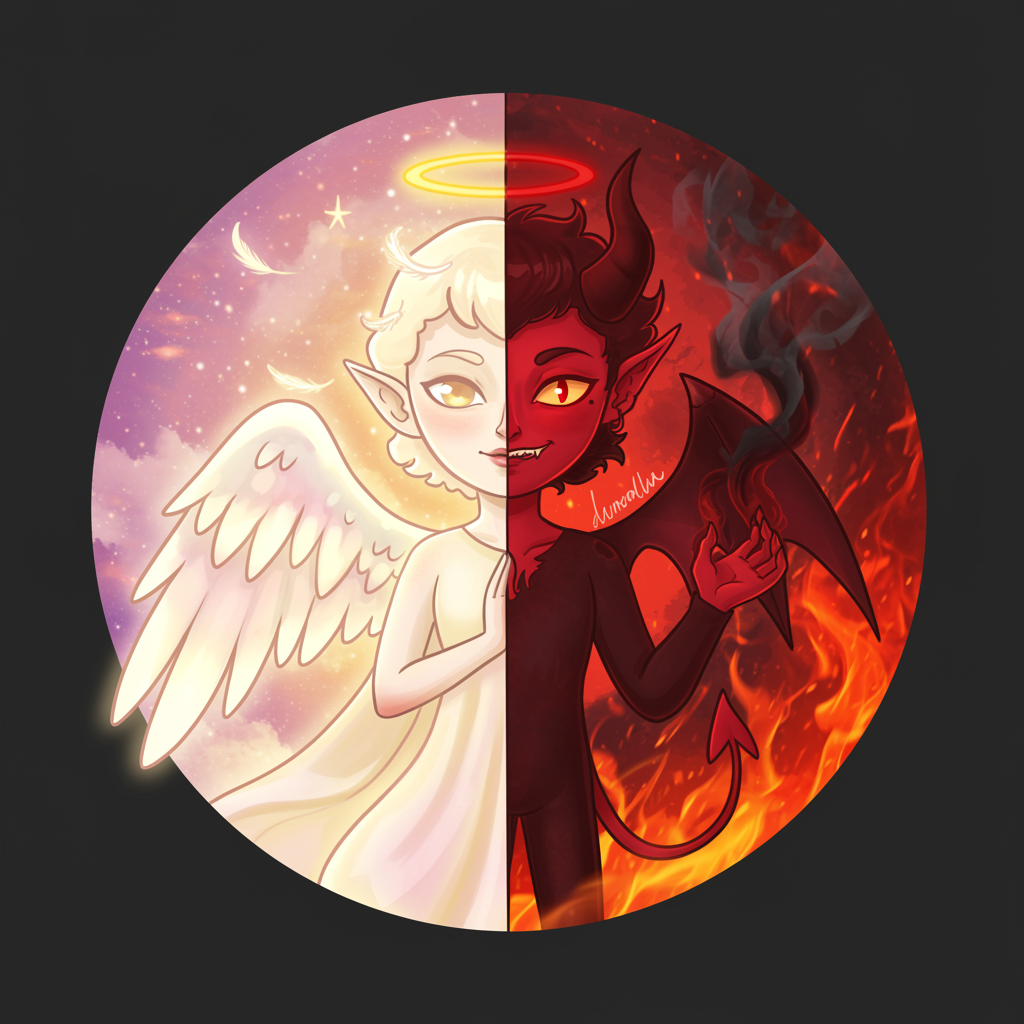 A whimsical profile picture featuring a character with a split persona; on one half, a serene angel with softly glowing skin, feathered wings, and a golden halo, emanating calm and purity; on the other half, a mischievous devil with vibrant red skin, horns peeking through tousled hair, and a playful smirk, surrounded by flickering, smoky shadows; the duality symbolizes the complex balance of light and dark within human nature, with a colorful, swirling background that merges heavenly skies with fiery underworld elements, creating an intriguing and enigmatic vision perfect for sparking curiosity and conversation.
