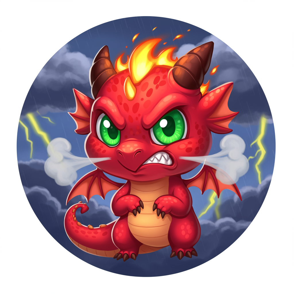 A vibrant, digitally illustrated profile picture featuring a tiny, fiery red dragon with emerald green eyes; its scales shimmer with incandescent hues as steam puffs from its nostrils in a comically furious expression, set against a background of stormy clouds with crackling miniature lightning, embodying a mix of adorable yet intense energy perfect for capturing the essence of "angry pfp."