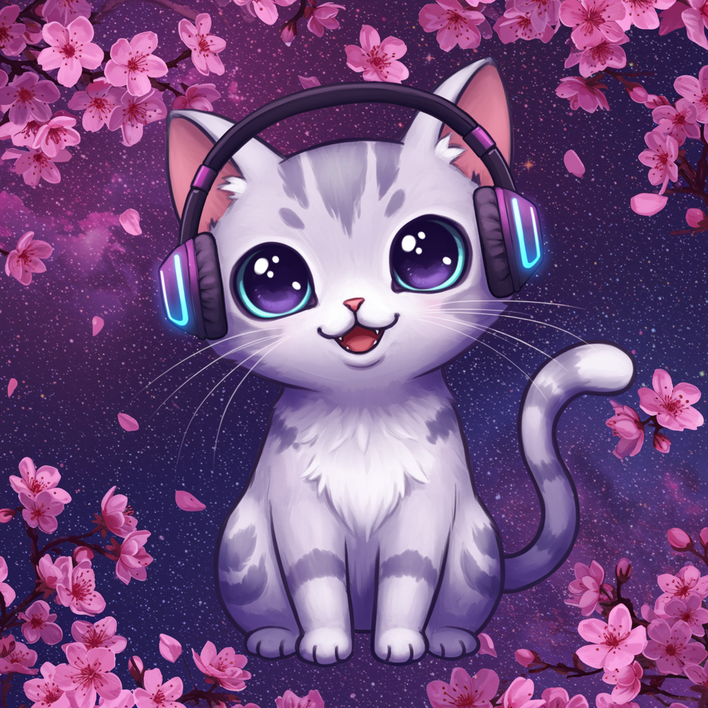 A whimsical anime-style cat with oversized, expressive eyes and a mischievous grin, sporting a pair of futuristic headphones adorned with glowing neon accents, sitting against a backdrop of a starry night sky interwoven with patterns of vibrant cherry blossoms, its fur shimmering subtly in shades of lavender and silver, exuding an aura of playful charm and enigmatic allure perfect for a captivating social media profile picture.