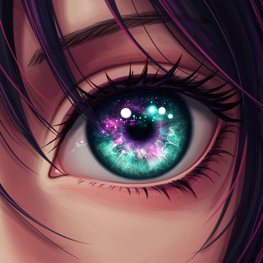 A captivating anime-style profile picture featuring a single, large, expressive eye that reflects a galaxy of swirling stars and nebulae, embodying both mystery and depth, with intricate lashes resembling delicate feathers and the iris shimmering with shades of violet and teal, framed by a few strands of vibrant hair adding an element of dynamic motion.