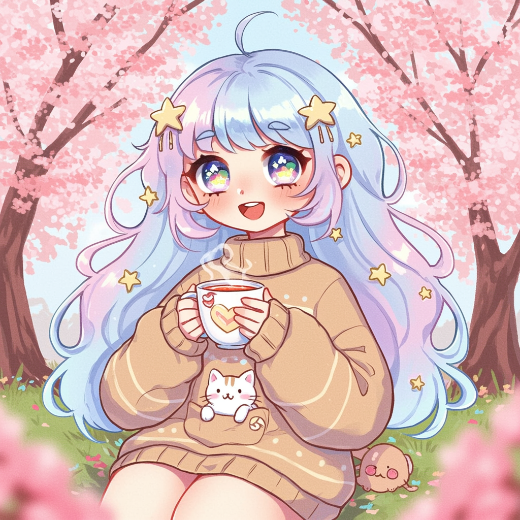 A whimsical anime character with oversized sparkling eyes and pastel-colored hair adorned with tiny star-shaped hairpins, wearing a cozy oversized sweater with a kitten peeking out from the pocket, sitting in a garden of blooming cherry blossoms while holding a steaming cup of tea, radiating warmth and joy through a gentle smile.