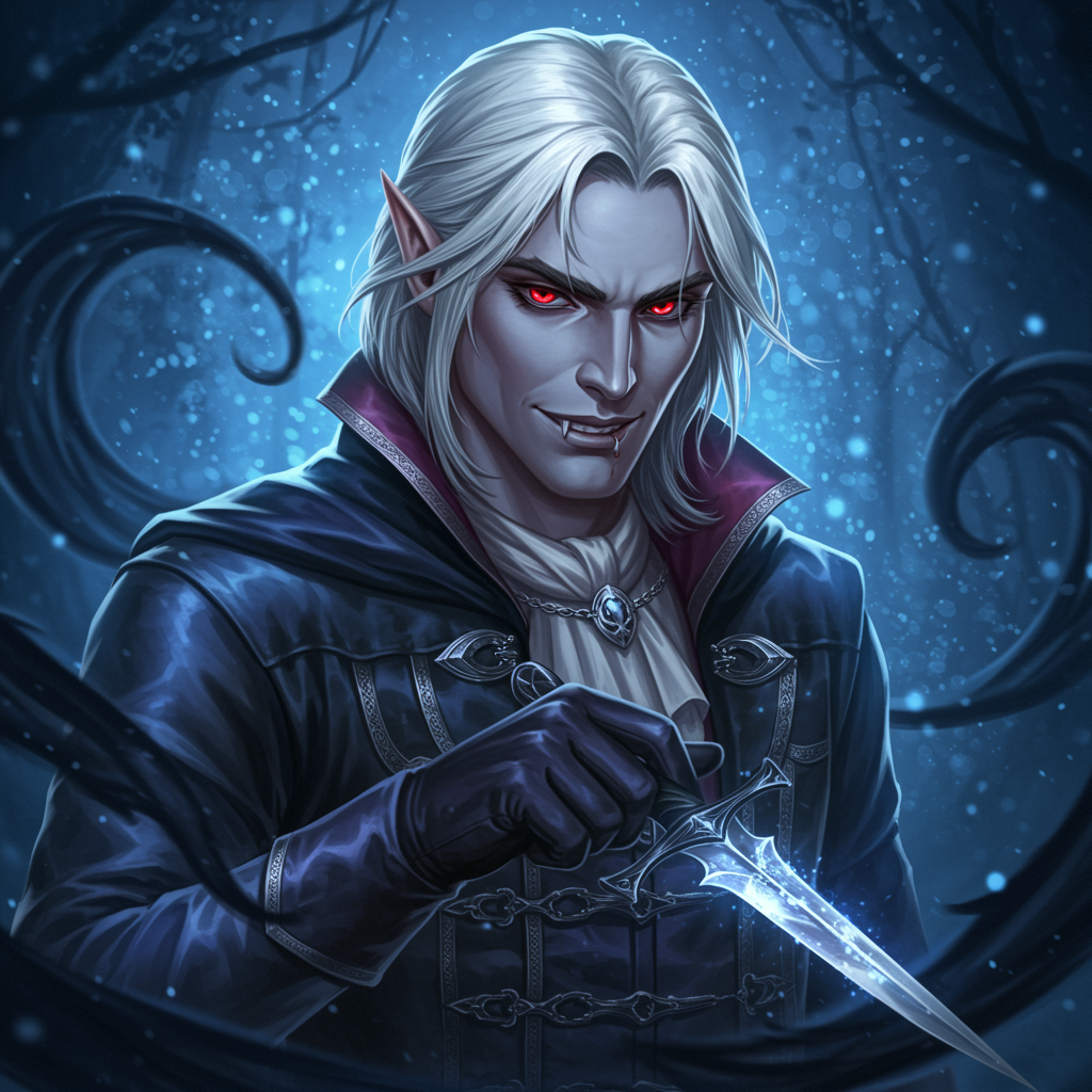 Envision a captivating pfp featuring Astarion, the enigmatic vampire rogue, set against a backdrop of a shimmering, moonlit forest. His piercing, crimson eyes glint with mischief and mystery, framed by silvery strands of hair that catch the dim light. A sly, knowing smirk plays on his lips as he slyly holds a glittering dagger. Shadowy tendrils of mist swirl around him, accentuating his aura of danger and charm. This magical scene is bathed in an otherworldly blue and silver glow, evoking the essence of an ageless, charismatic figure from a dark fantasy realm.