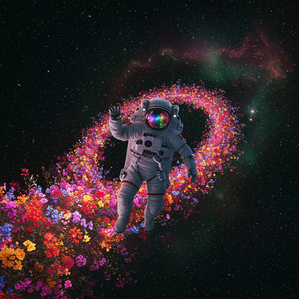 An adventurous astronaut floating amidst a cosmic garden of vibrant, glowing flowers spiraling through the Milky Way, their reflective helmet mirroring a distant nebula swirling with colors that echo the aurora borealis, casting a serene yet otherworldly glow across the stardust path they glide along, capturing the magic and infinite possibilities of the universe in their eyes as if they are the explorers of dreams yet unimagined.