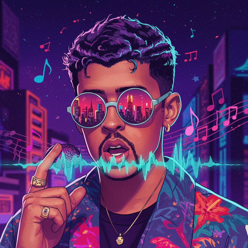 An animated profile picture capturing the essence of Bad Bunny, blending elements of his iconic fashion style with a vibrant color palette and surreal elements. Imagine Bad Bunny in a futuristic urban setting, wearing bold, avant-garde sunglasses that reflect a neon skyline with hints of musical notes floating in the air. His hairstyle is accentuated by glowing streaks of color, and he holds a microphone that emits pulsating waves, symbolizing his dynamic energy and influence in the music world. Subtle hints of Puerto Rican culture, like the coquí frog or tropical flora, peek through, creating a unique, energetic, and creative representation of the artist.