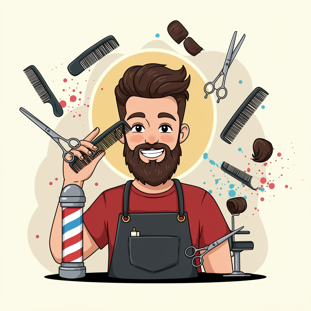 A vibrant and dynamic cartoon-style depiction of a barber with a stylish haircut and meticulously groomed beard, showcasing a confident smile while surrounded by a halo of floating scissors and combs. The background is a subtle blend of classic barbershop elements like a spinning pole and vintage chairs, with whimsical splashes of color representing creativity and skill, encapsulating the essence of a modern, trendy barber in a lively and eye-catching profile picture.