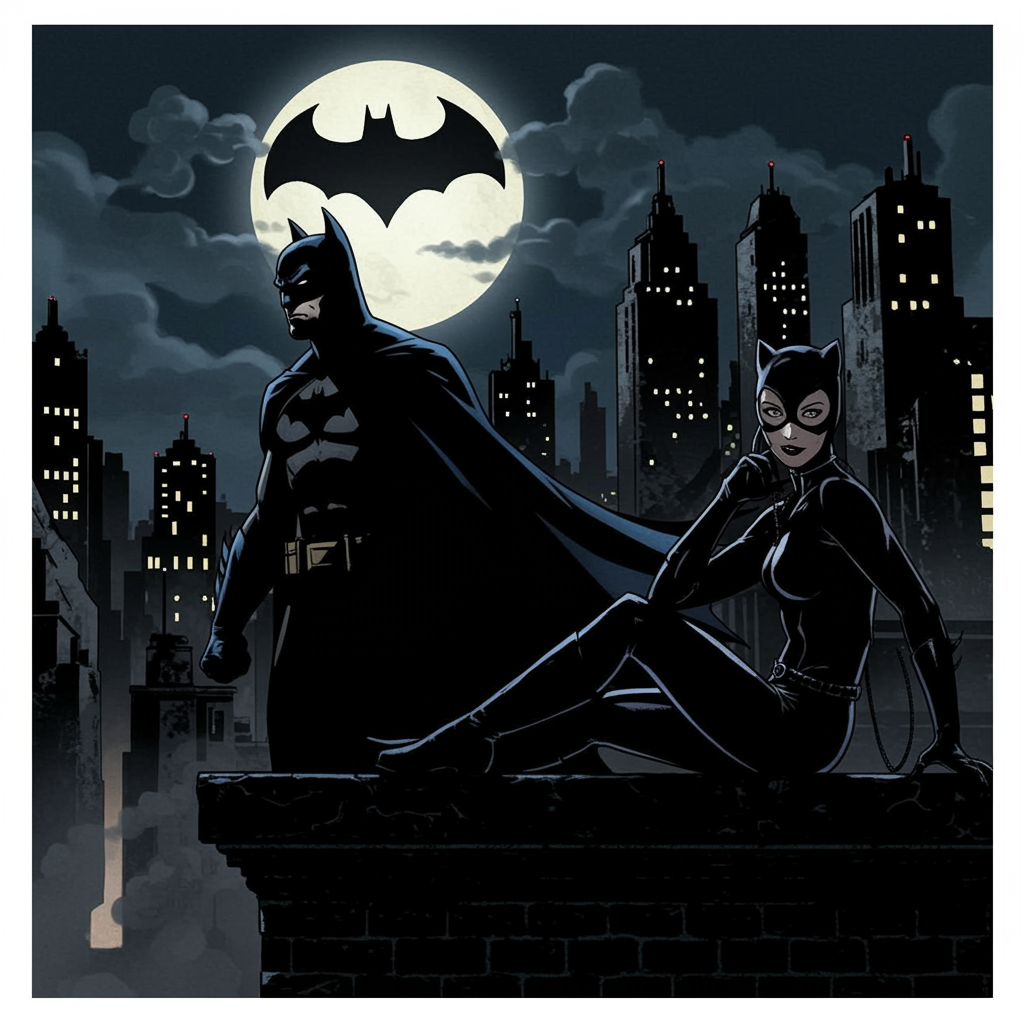 In a dimly lit Gotham City skyline, Batman stands tall against the moonlit backdrop, his cape billowing dramatically as the iconic Bat-Signal illuminates the night sky. Nearby, Catwoman lounges gracefully on a rooftop ledge, her silhouette sleek and mysterious, with her eyes reflecting the shimmering city lights. The duo is united by an unseen bond, with subtle hints of their character traits intertwined—a glint of determination in Batman's gaze and a playful smirk on Catwoman's lips—capturing the essence of their dynamic partnership. This matching profile picture set encapsulates the perfect blend of dark allure and heroic intensity, complementing each other while maintaining their individual allure.