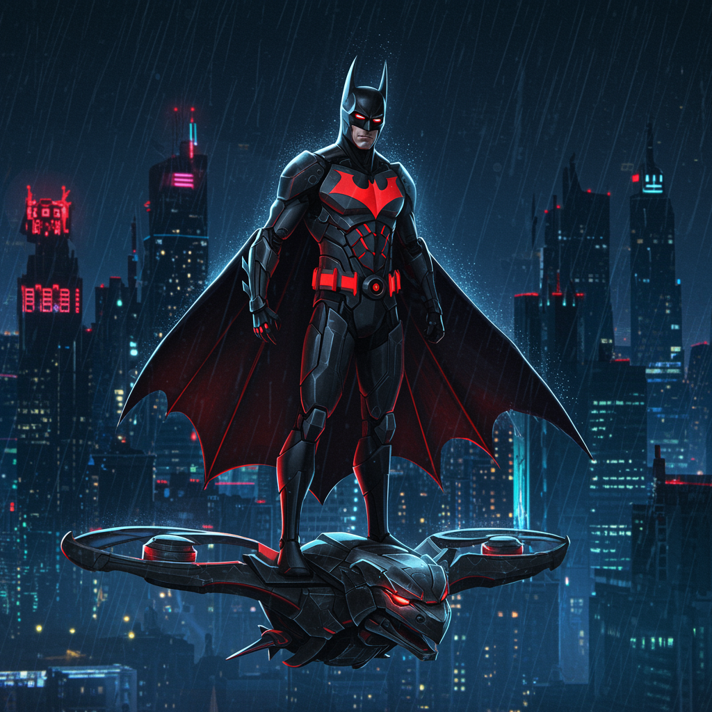 Envision an electrifying profile picture depicting a futuristic, neon-lit Gotham City skyline in the background, with a sleek and modern reinterpretation of the Batman Beyond suit in the foreground. The suit features sharp angles, glowing red accents, and metallic textures, creating a dynamic contrast against the dark cityscape. Batman Beyond stands poised on a high-tech gargoyle-shaped drone, his cape flowing like liquid shadow, as digital rain cascades around him, capturing the essence of both mystery and advanced technology. The atmosphere should exude an air of vigilante mystique and cutting-edge innovation.