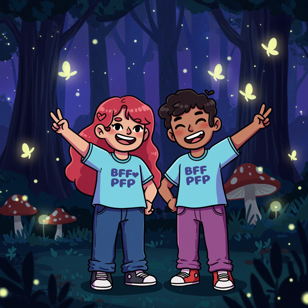 Two cartoon characters, each embodying vibrant personalities, stand side by side in a whimsical, colorful forest filled with magical elements like glowing mushrooms and fluttering luminescent butterflies; they wear matching T-shirts with quirky phrases, share wide, infectious smiles, and hold up peace signs to the sky, encapsulating an eternal sense of friendship and fun, perfectly capturing the essence of "bff pfp".