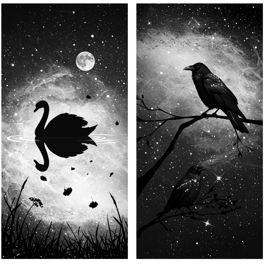 Imagine a pair of black and white profile pictures designed to represent a deep connection between two personalities. In the first image, a silhouette of a graceful swan sits serenely on a moonlit pond, its feathers gently ruffled by a soft breeze, while the second image mirrors this with an elegant raven perched on a tree branch, its shiny feathers gleaming under the starlit sky. The background in both images is a dreamy mix of shimmering stars and abstract swirling patterns, creating a mystical aura. Together, these pfps evoke a sense of harmony and contrast, symbolizing unity and individuality through the metaphor of day and night.