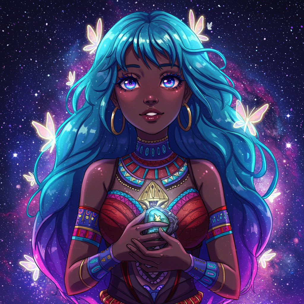 A vibrant, surreal portrayal of a black anime girl with deep, expressive eyes and glowing cerulean hair that cascades like a waterfall adorned with ethereal luminescent butterflies; her expression is a captivating mix of mystery and joy as she stands against a cosmic background of swirling galaxies and twinkling stars, her outfit an elegant fusion of futuristic armor and traditional African patterns, blending cultures through vivid colors and intricate designs; embodying a sense of adventure and empowerment, she holds an ancient looking artifact that reveals a universe of possibilities in a compact, mesmerizing image perfect for a social media profile picture.