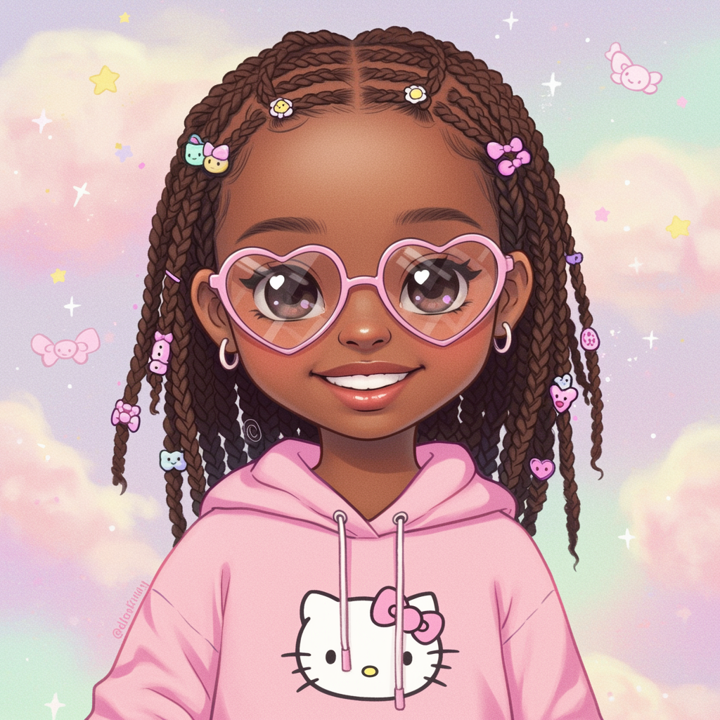 Imagine a whimsical scene featuring a young black girl with a radiant smile, her hair styled in playful, colorful braids adorned with tiny charms. She dons a pastel pink hoodie with the iconic Hello Kitty face embroidered on the front. The background is a dreamy blend of soft, swirling pastel colors, reminiscent of cotton candy skies, where floating stars and tiny Hello Kitty bows drift by. Her large, expressive eyes sparkle with curiosity and mischief, framed by funky, oversized heart-shaped glasses. The scene is playful and vibrant, capturing the essence of youthful joy and the beloved charm of Hello Kitty.