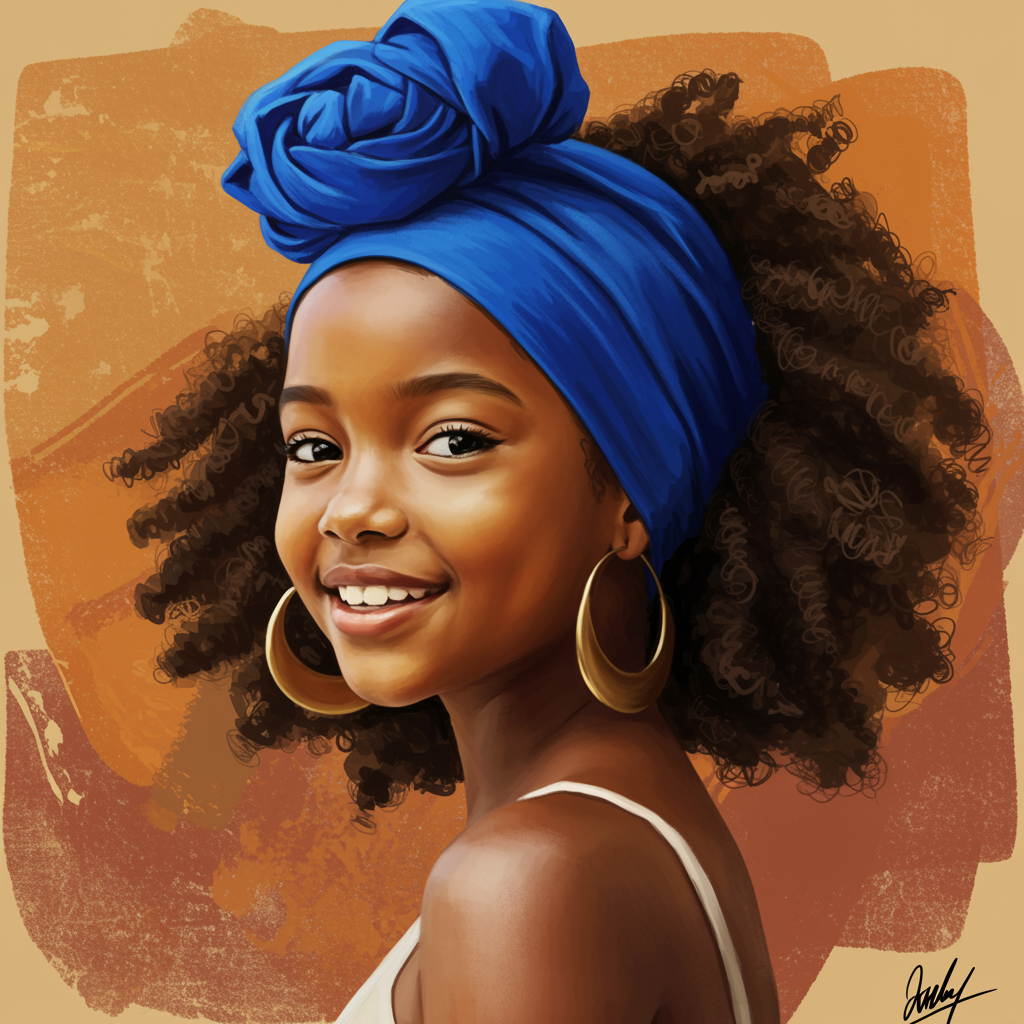 A vibrant and empowering portrait of a young Black girl, adorned in a striking royal blue headscarf, her eyes sparkling with wisdom and joy. The background is a kaleidoscope of abstract shapes in warm earth tones, symbolizing strength and resilience. Her expression is one of confidence and individuality, capturing the essence of her dynamic spirit. Her natural curls are highlighted by a soft, golden light, creating a sense of depth and warmth, making her presence magnetic and iconic.