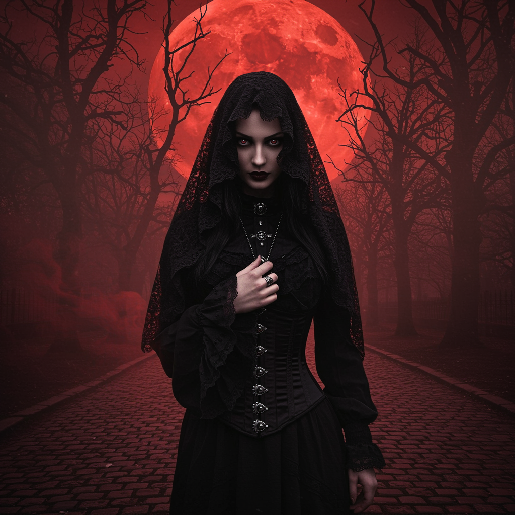 A hauntingly beautiful profile picture featuring a mysterious figure clad in Victorian gothic attire with features obscured by shadow and crimson mist, an intricate lace veil partially revealing piercing eyes reminiscent of an ancient hunter, standing in the midst of an abandoned cobblestone street with silhouettes of twisted, gnarled trees under a dimly lit, blood-red moon.